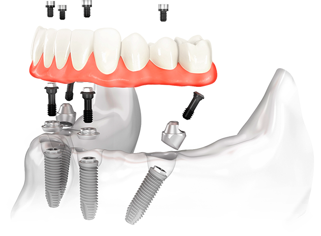 Суть метода «все на четырёх» в опоре конструкции на 4, особенным образом установленных имплантата, взамен традиционной опоры на 6 или 8 имплантатов. Это позволяет восстановить жевательную функцию с меньшими затратами и без операций по наращиванию костной ткани. Такая технология обеспечивает устойчивость конструкции, предотвращает смещение при пережевывании пищи и не требует длительного послеоперационного ухода.
